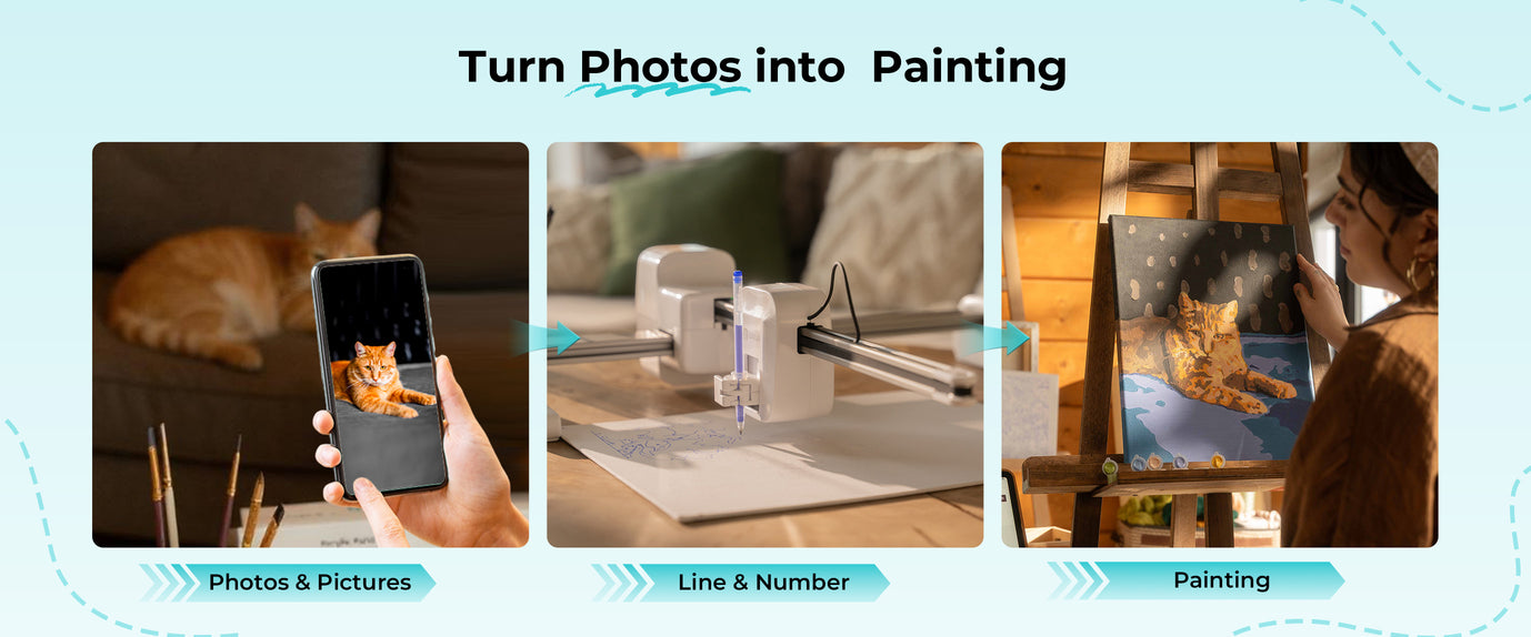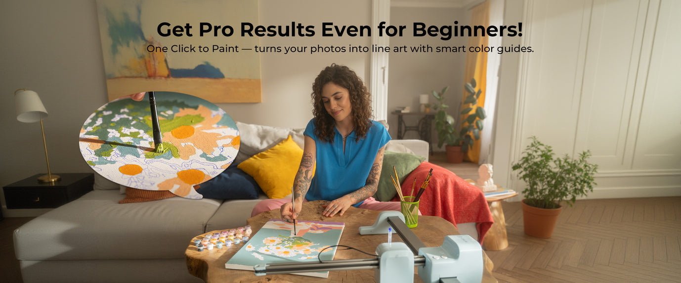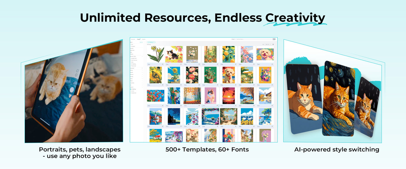 Access endless art resources and fonts—design gifts, cards, and decor. AI transforms your ideas into ready-to-paint art.