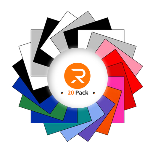 Each Heat Transfer Vinyl Bundle includes 20 sheets of high-quality HTV vinyl in 13 vibrant, rich colors to meet all your project needs. It includes 3 sheets each of Black and White, 2 sheets each of Red, Silver, and Royal Blue, plus 1 sheet each of Pink, Emerald Green, Purple, Fluorescent Rose Red, Garnet, Green, Sky Blue, and Fluorescent Orange.