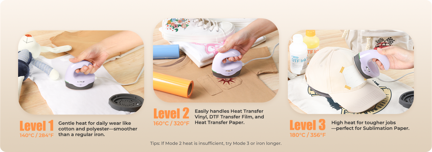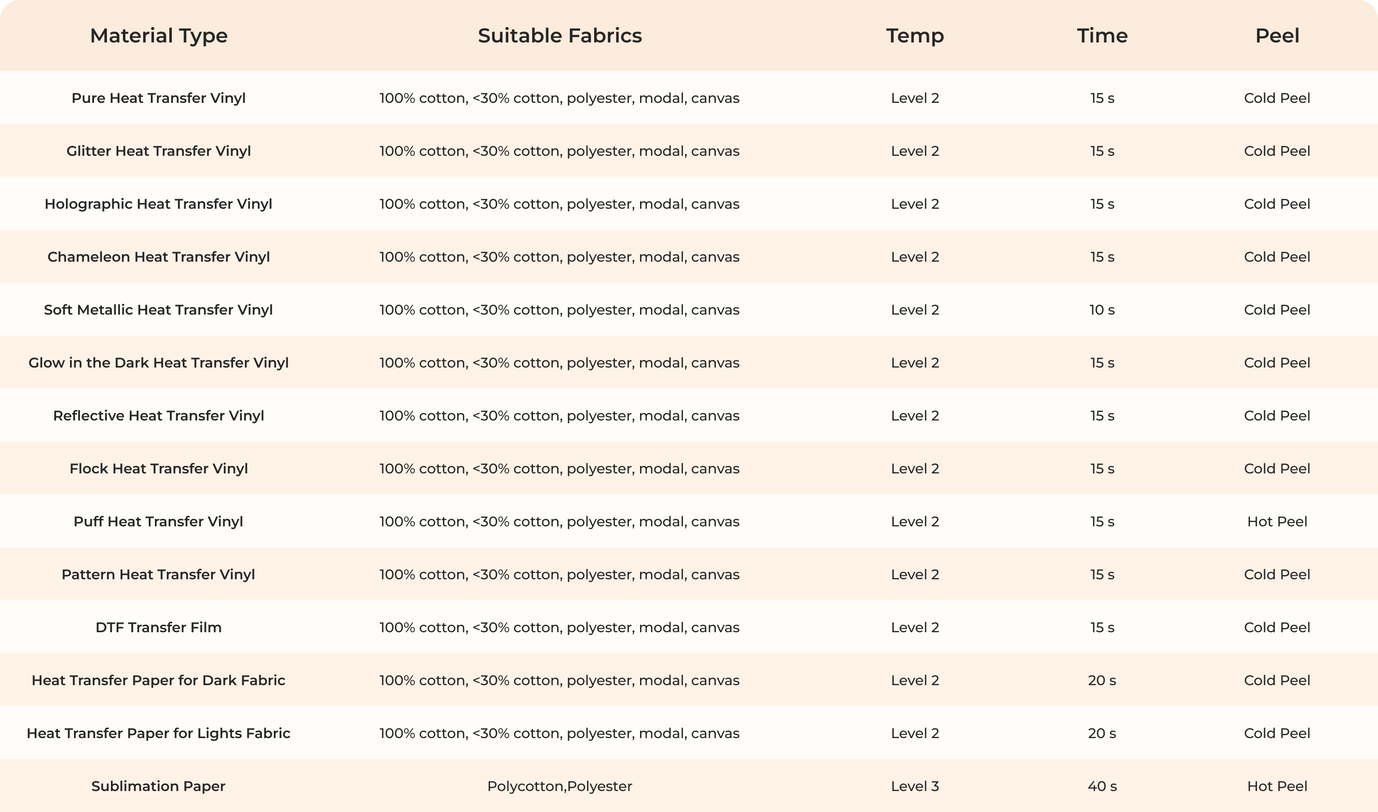 A1: Set the temperature as recommended in the QuickReference Chart;A2: For best results, use HTVRONT supplies and follow our redcommended parameters.