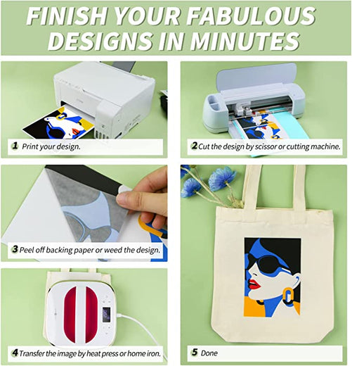 Our iron on transfer paper is beginner-friendly. Simply print-cut-peel-press, you will finish your fabulous designs in minutes. What's more, our printable htv vinyl is compatible with most cutting machine, allowing you to say yes to more complicated designs, even for letters.
